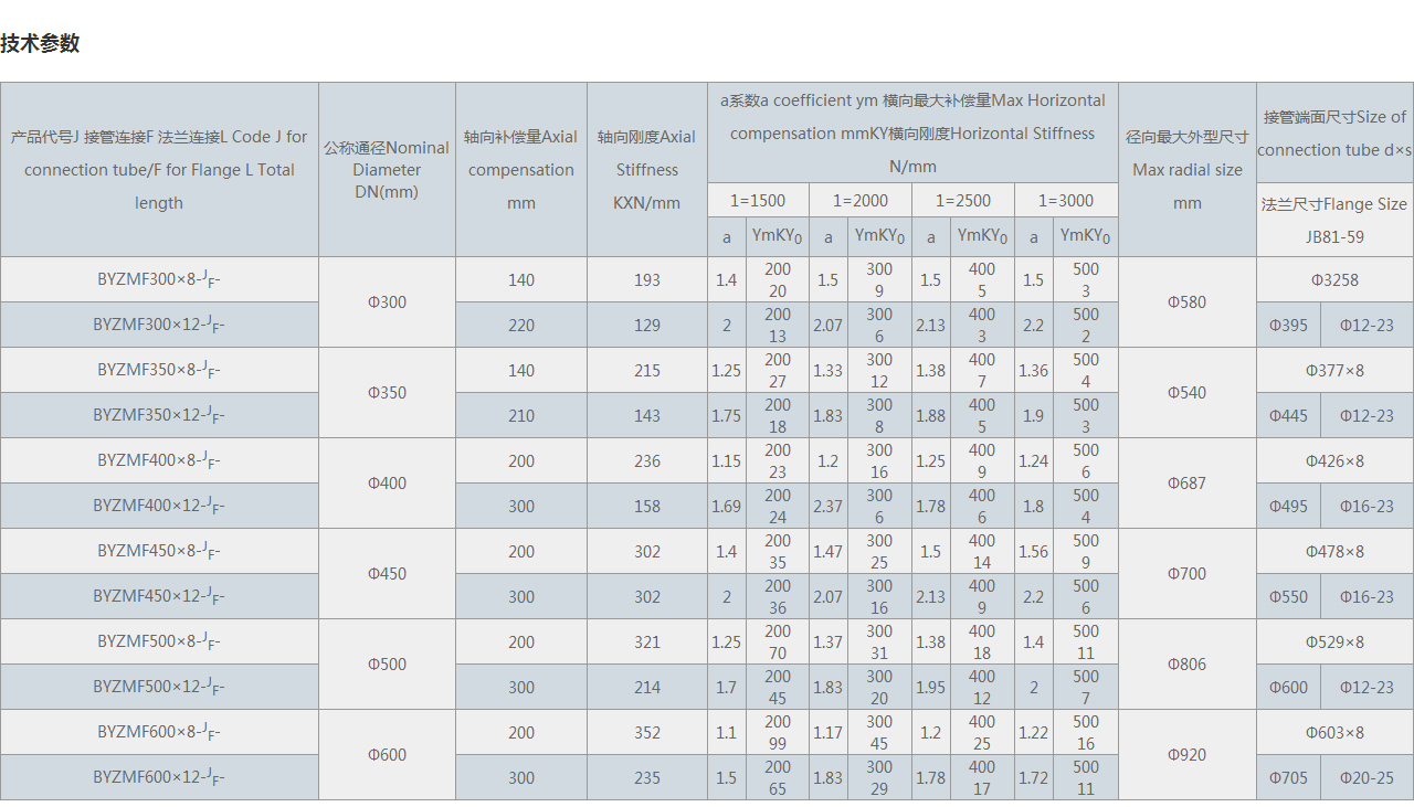 軸向補償量Axial compensation mm | 軸向剛度Axial Stiffness KXN/mm | a系數a coefficient ym 橫向很大補償量Max Horizontal compensation mmKY橫向剛度Horizontal Stiffness N/mm | 徑向很大外型尺寸Max radial size mm | 接管端面尺寸Size of connection tube d×s | ||||||||